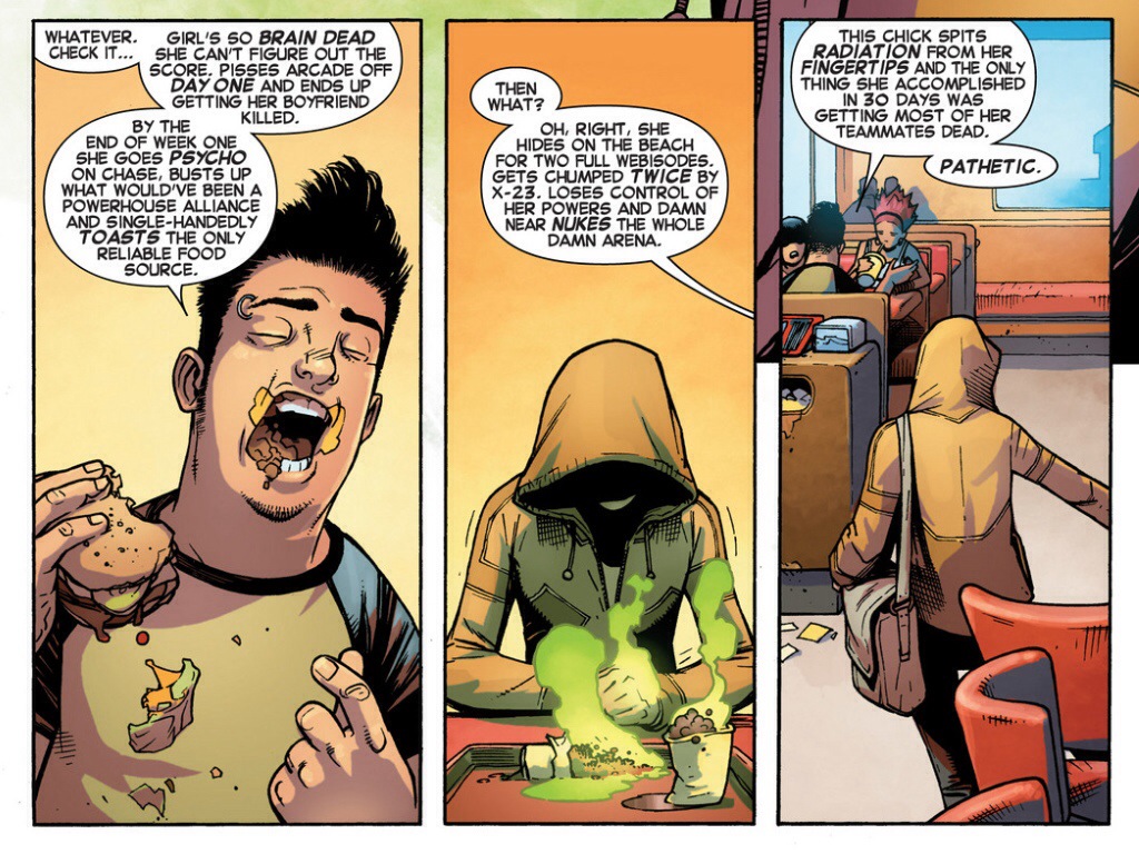 My two favourite parts of the book essentially cannibalize fan reaction to the series, and use it as bizarro fodder in the comic itself. This starts right at the top as Hazmat deals with a jerk who is loudly talking to his friends about how he thought she was the worst combatant on the murder island. He talks about what he would have done in the arena in her situation, feigning greatness in the face of zero consequences.